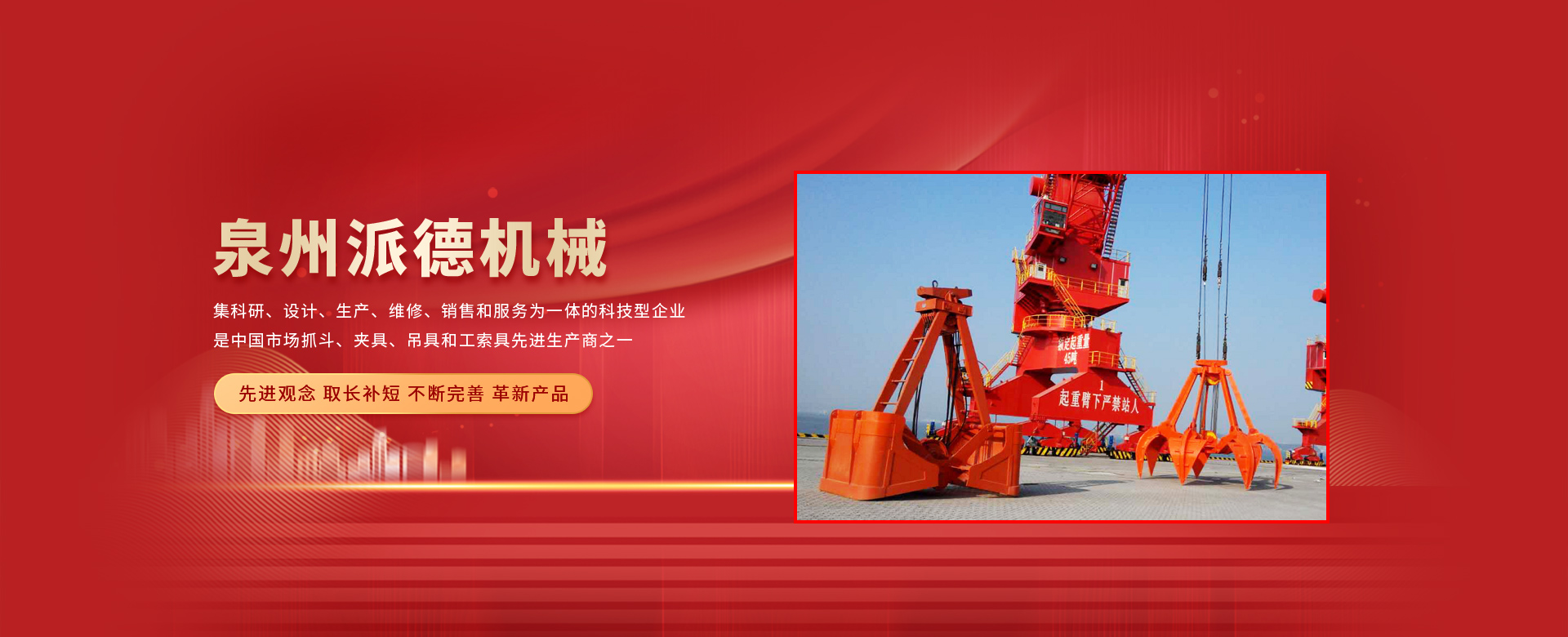 泉州派德機(jī)械有限公司成立于2012年5月,位于全國文明的古城福建泉州,公司擁有各類型專業(yè)員工82人,其中高級工程師1人,工程師4人,助理工程師5人,是一家集科研、設(shè)計、生產(chǎn)、維修、銷售和服務(wù)為一體的科技型企業(yè),是中國市場抓斗、夾具、吊具和工索具先進(jìn)生產(chǎn)商之一。產(chǎn)品采用國內(nèi)外先進(jìn)的設(shè)計方案、技術(shù)規(guī)范、制造過程、工藝流程和服務(wù),憑借在抓斗、夾具、吊具和工索具領(lǐng)域的超前設(shè)計理念和成熟的技術(shù)、工藝和管理,在抓具領(lǐng)域迅速崛起。